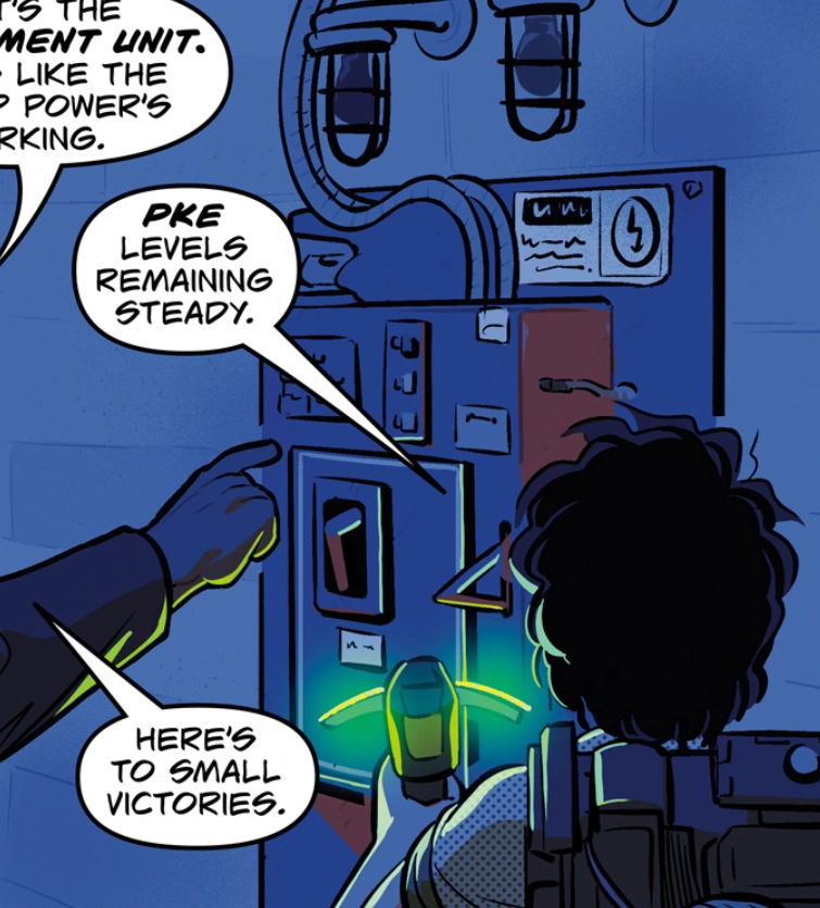 - ↑ Egon Spengler (2020). IDW Comics- "Ghostbusters Year One Issue #4" (2020) (Comic p.6). Egon Spengler says: "Our Containment Unit was pushing capacity, and the ghosts inside were attracted like iron to a magnet by that massive influx of PKE."