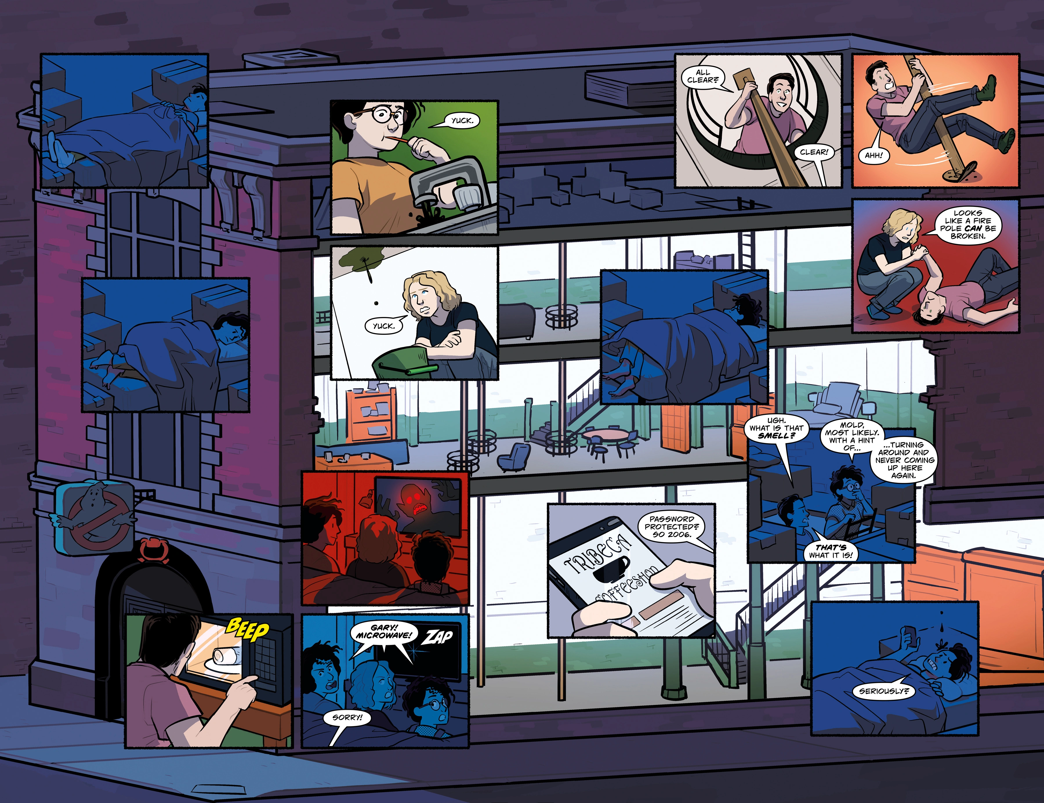 Trevor asked Phoebe if she had a first day of school from Hell, too. Phoebe asked which layer of Hell. Gary invited them in and revealed Callie made quesadillas. Callie and Gary shared a bedroom on the second floor while Phoebe and Trevor occupied their own bedrooms on the third floor. Over the next several days, they had several setbacks. A muck came out of the faucet when Phoebe tried using the sink. Some ectoplasm dripped from the second floor ceiling. Gary accidentally used the microwave when everyone was trying to watch television and caused a short. Gary tried one of the fire poles and discovered the hard way it was broken. Trevor was unable to find any free WiFi in the area. Gary and Phoebe checked the attic but immediately smelled something bad. Phoebe called it mold "with a hint of turning around and never coming up here again." Gary agreed with her assessment. Ectoplasm dripped down on Trevor's head while he was trying to sleep in his bed.