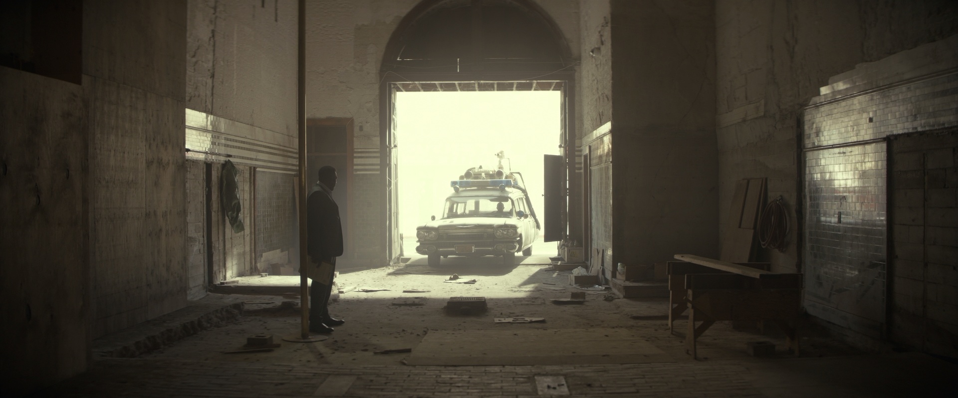 After the battle in Summerville in June 2021, Winston purchased the Firehouse.[Note 1] One day, Winston entered the rundown Firehouse through one of the inner doors and looked up a fire pole in the garage bay. The doors of the Firehouse opened up. Winston motioned the driver to drive Ecto-1 inside. He placed a hand on the hood. In the basement, a red light on the Containment Unit was blinking. It made an odd sound.