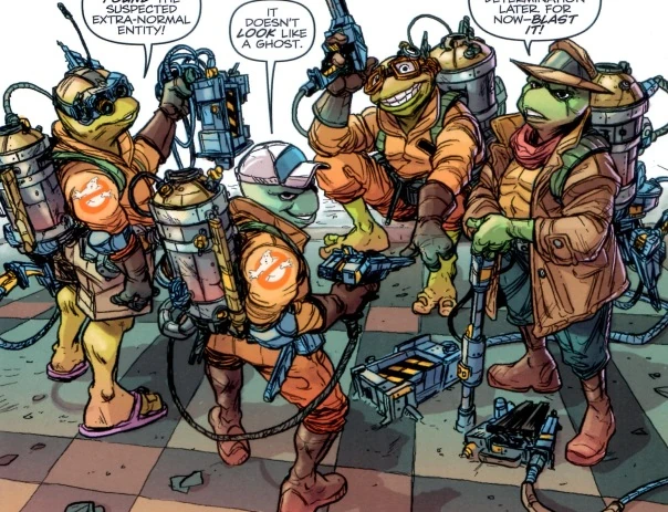 - On page 2 of TMNT/Ghostbusters Volume 2 Issue #3, the manner in which Peter is captured with slime mirrors how the Peoplebusters capture humans in The Real Ghostbusters episode "Flip Side".