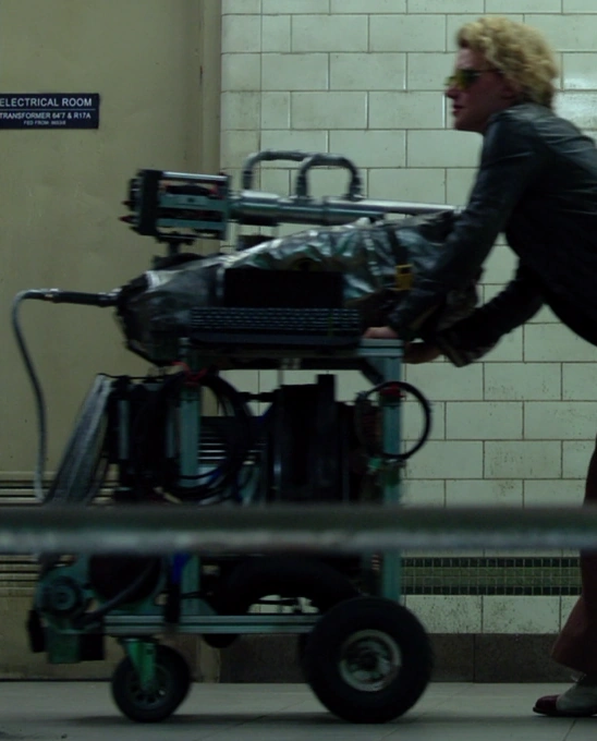For the Conductors of the Metaphysical Examination's first official investigation, Jillian Holtzmann carted the Proton Box down into the Seward Street Subway Station. A grounding device was also built into the device for safety purposes.[1][2] However, it was still in its early stages and was both untested and highly unstable.[3][4] Holtzmann powered up the Proton Box and typed on a keypad once she saw the Electrocuted Ghost. Abby Yates declared they were talking the ghost back to the lab. Holtzmann cautioned the technology was in its early stages. At 4:21 pm, Holtzmann handed a bulky particle thrower to Erin Gilbert. Holtzmann told her the thrower was going to shoot a proton stream at the ghost and instructed her to wait for her go ahead. Erin inquired why she was operating the untested nuclear laser. Holtzmann noted she had the longest arms.[5]