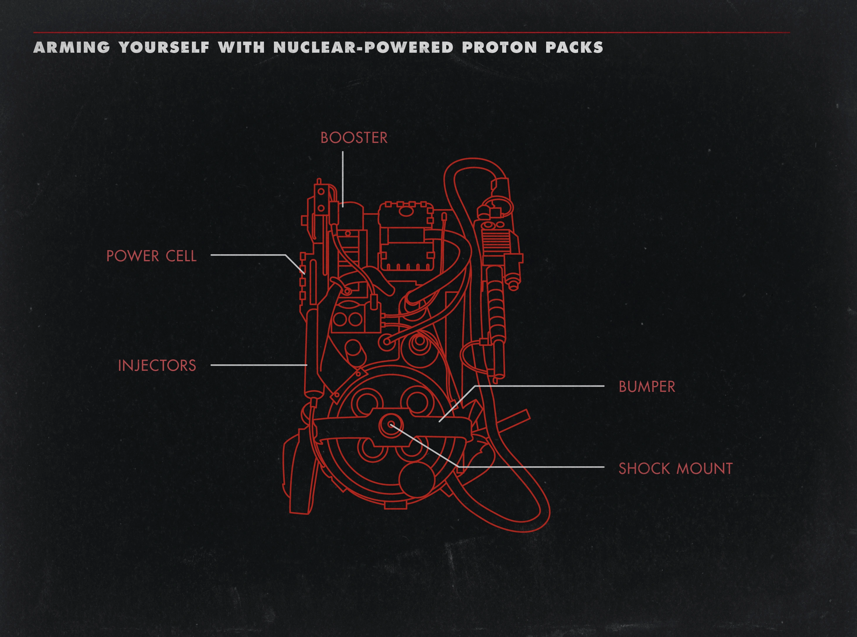 - For the Proton Pack, Stephen Dane based his rough sketches on flamethrowers he recalled from military magazines. He bought a pack frame from California Surplus, on Santa Monica and Vine, and built a rough mock-up of the backpack flamethrower idea. Dane and Reitman talked and refined the design. The working design then went to the prop builders. Dane continued to guide the construction and bought some parts to be used in the early mock-up phase.[20]