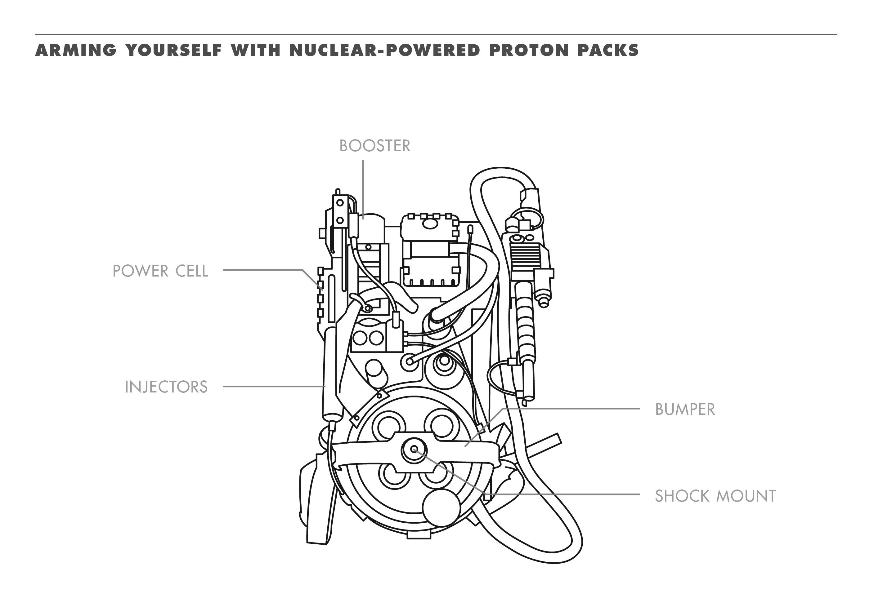 Designed in 1984 by Egon Spengler and Ray Stantz, the Proton Pack countered the negative energy of ghosts with a Proton Stream, a stream of positively charged ions. The stream contained a ghost upon contact. The Proton Stream was very dangerous and barely controllable. At the Sedgewick Hotel, Ray realized they had not achieved a completely successful test of their equipment. Egon blamed himself. A sucessful "field test" was conducted on a Chambermaid's cart. Egon later informed the other Ghostbusters that crossing Proton Streams would result in "total protonic reversal," causing all life as we know it to stop instantaneously and every molecule in a user's body to explode at the speed of light. The Proton Pack made the cover of the October 1984 issue of Omni.