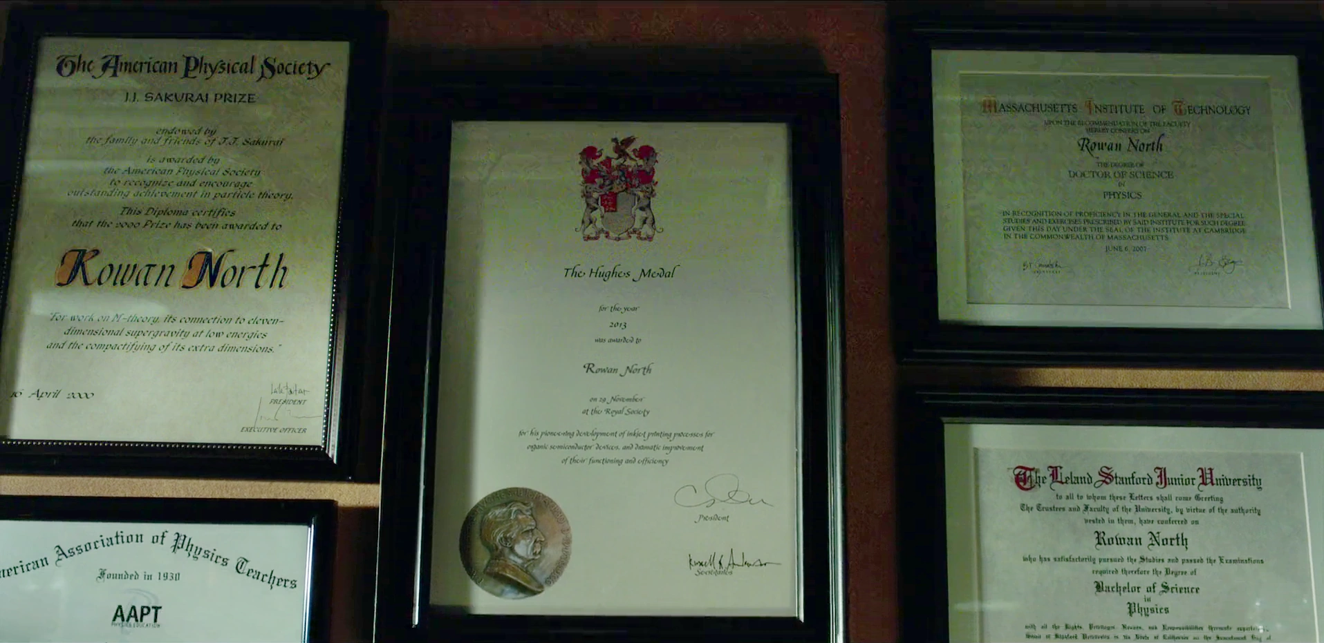 - MIT consultant Janet Conrad wrote a string theory paper on Feynman ghost diagrams for Rowan North's room. She intended it as also a bit of a jab at disciplines - one protagonist, Erin, is a neutrino theorist and the antagonist, Rowan, is a string theorist. It can be seen posted up above his desk phone.[24]