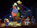 The Ghostbusters and Bob stumbled onto a live set for "Space Avengers of the Galaxy" and accidentally shot a Megazoid robot. The loud mouth director is fuming and got into a brief fight with Peter. Afterwards, Bob suggested they leave their equipment someplace safe - the prop room. Once they leave, some workers bring in prop packs. Confused by the four real ones, they lugged them back to storage. As workers try to restore the Megazoid, it comes to life on its own and asks everyone to be quiet. Egon announced he got some very high readings off of it because there was a ghost inside.