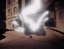 In the evening, Ecto-1 pursued a Jabberwocky down 16th Street. Peter reminded everyone it wasn't his fault they were in this situation and insinuated Ray chased it through an Alice in Wonderland display at the library. The Jabberwocky ducked into an alley. The Ghostbusters searched around carefully while they recited the Jabberwocky poem. Suddenly, it popped out of a garbage can and grabbed Slimer. It exhaled and blew the guys into a wall. Slimer got lose in time and the Ghostbusters confined the Jabberwocky in four streams. However, it was impossible to get a Ghost Trap out. Slimer saved the say and laid out a Trap for Ray. As the Jabberwocky was drawn in, it tried to grab at Slimer but lost his grip just in time. Peter was impressed and declared they should use Slimer for sheep dogging for every bust.
