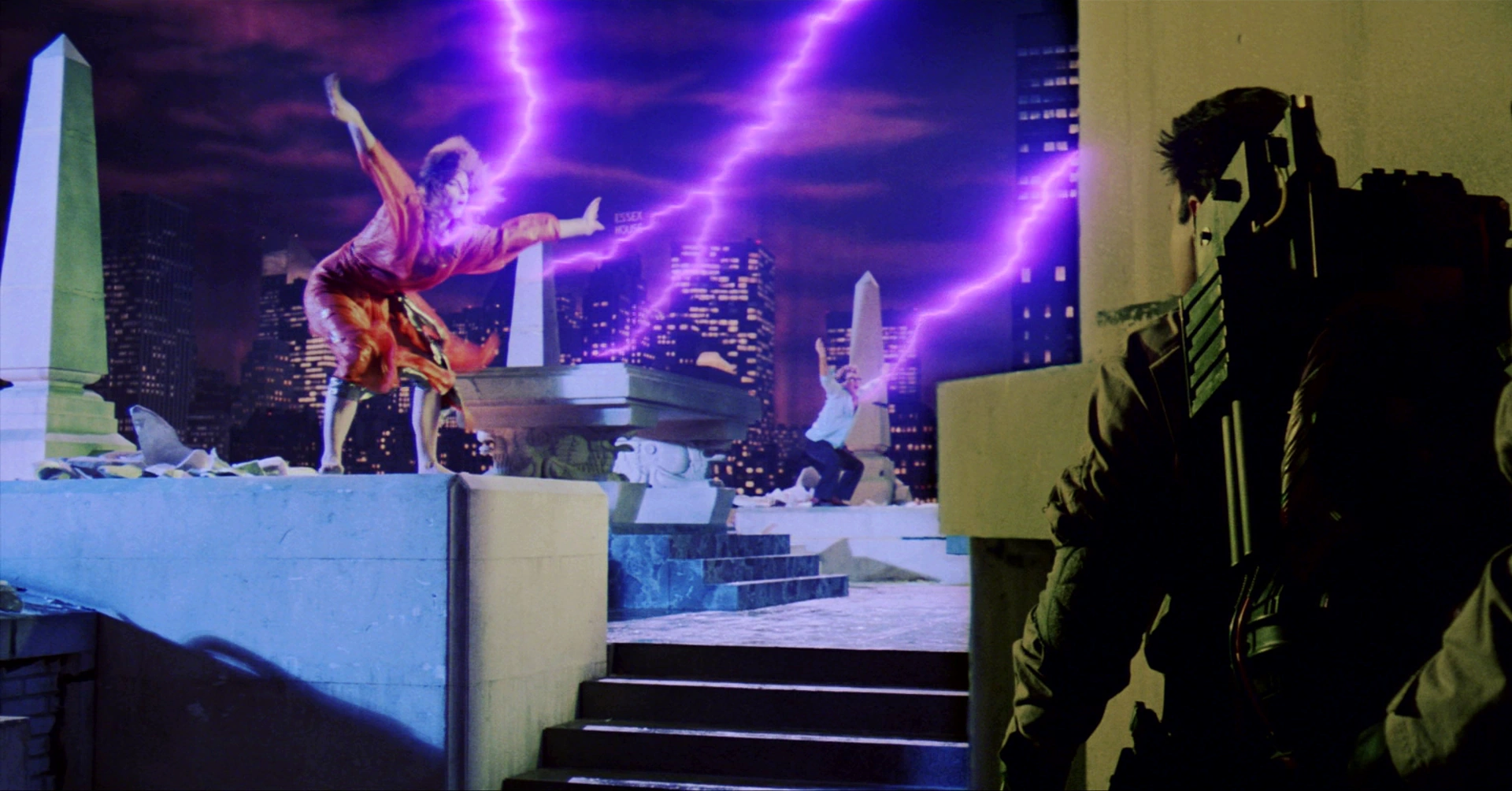 As the Ghostbusters made their way through Dana's apartment both Zuul and Vinz, now standing in the opposite pedestals once occupied by their Gothic statues, raised their arms to the sky, slowly. Suddenly they were both struck by bolts of lightning which they redirected towards the large temple doors, causing them to open. Once the doors were completely opened, Zuul began to absorb the supernatural lightning bolts, shaking violently and smiling as the Ghostbusters finally arrived and stared at her and Vinz. Having absorbed enough demonic energy, Zuul began to lower her arms down to the pedestal surface, her body thrashing uncontrollably under the force of the lightning shooting through her. As her hands touched the pedestal, a large lightning blast converged on her, transforming her and Vinz from Dana Barrett and Louis Tully's human forms back into their natural, satanic Terror Dog forms. The two beasts turned and roared menacingly at the Ghostbusters before taking their positions beside the crystalline temple doors which revealed Gozer. After the Ghostbusters crossed the streams and defeated Gozer, the full protonic reversal also affected Zuul and Vinz, turning their beastly bodies back to stone, leaving Dana Barrett and Louis Tully trapped inside their respective shells. The Ghostbusters dug them out and they survived, having no recollection of any of their actions while under demonic possession.